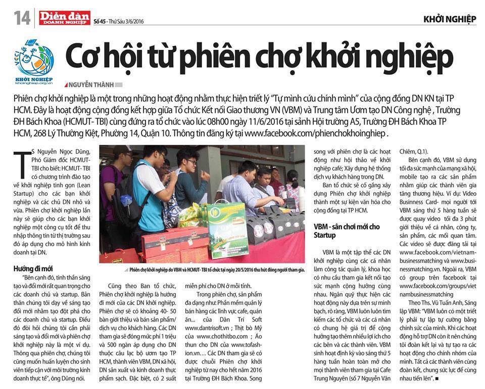 Đây là hoạt động cộng đồng kết hợp giữa Tổ chức Kết nối Giao thương VN (VBM) và Trung tâm Ươm tạo DN Công nghệ, Trường ĐH Bách Khoa (HCMUT- TBI) cùng đứng ra tổ chức vào lúc 08h00 ngày 11/6/2016 tại sảnh Hội trường A5, Trường ĐH Bách Khoa TP HCM, 268 Lý Thường Kiệt, Phường 14, Quận 10. Thông tin đăng ký tại www.facebook.com/phienchokhoinghiep.