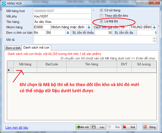 + Khi Thêm thông tin hàng hóa; check chọn Là mã bộ; ta nhập Mã hàng hóa là mã của bộ hàng hóa, Tên hàng hóa là tên của bộ hàng hóa (vd: bộ hàng hóa A); ĐVT là Bộ. Sau đó, vào tab Danh sách mã con, dưới lưới ta gõ mã hàng để thêm vào ví dụ: món A1, món A2 ... và gõ số lượng cho phù hợp.