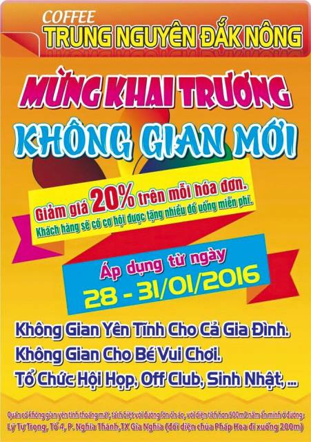 Coffee Trung Nguyên Đak Nông: phong cách cà phê sân vườn, là quán cà phê lớn tại Đak Nông. Có không gian yên tĩnh, tách biệt với đường lớn ồn ào, với diện tích hơn 500m2, phù hợp cho cả gia đình, không gian dành riêng cho bé vui chơi, là nơi tổ chức hội họp, offline, sinh nhật tuyệt vời. Chương trình mừng khai trương không gian mới giảm giá lên đến 20% áp dụng từ 28/01 - 31/01/2016. Địa chỉ: Lý Tự Trọng, Tổ 4, Phường Nghĩa Thành, Thị xã Gia Nghĩa, Đak Nông (đối diện chùa Pháp Hoa đi xuống 200m).